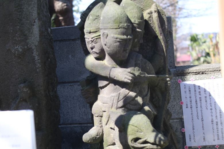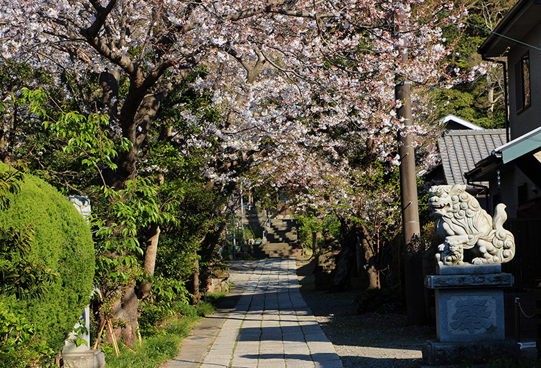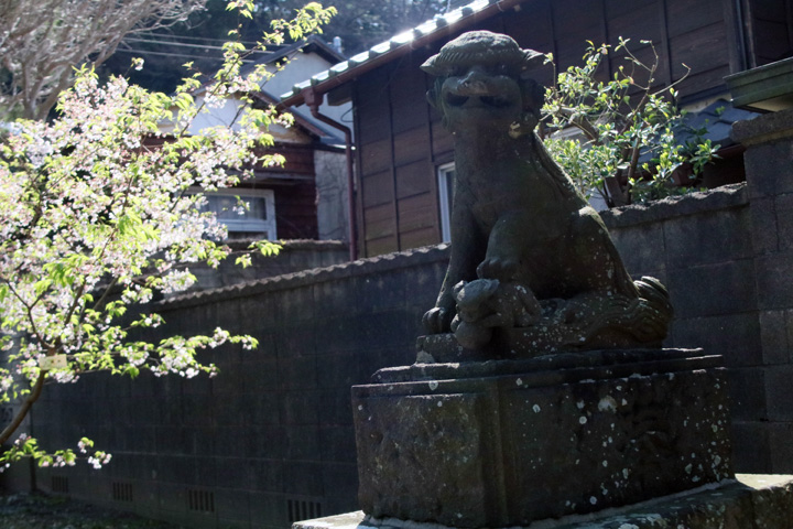 大正五年に小坪トンネルを堀削した際の残土を材木座三丁目の湿地帯に埋め立てました。その地主たち十三名が寄進したものです。狛犬は魔よけとして、また神様のお使いとされています。