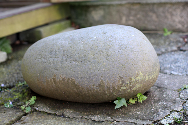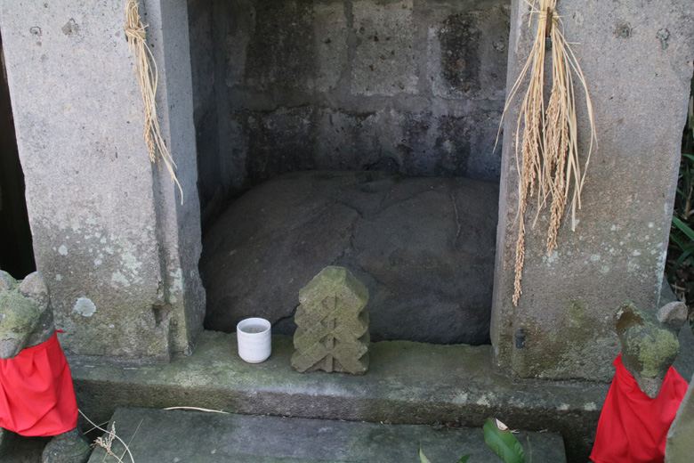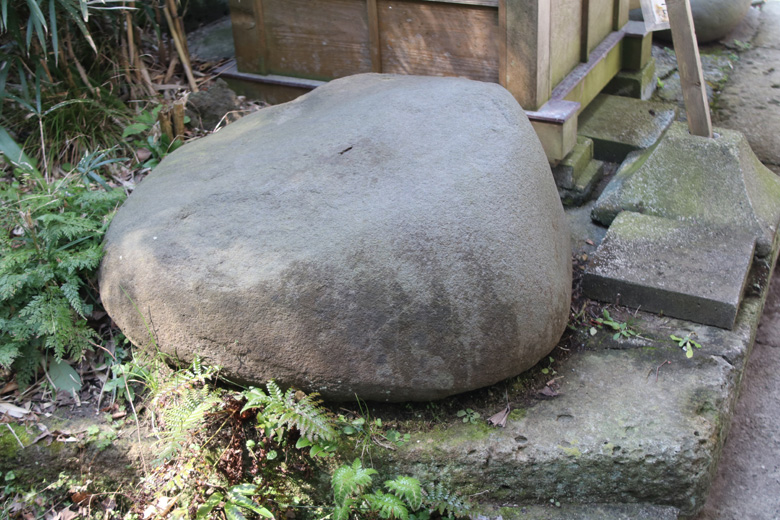 通称黒石と呼ばれ、重さ三十貫目あります。他に赤石と呼ばれる重さ四十貫目の石がありましたが、終戦間際の道路拡張の際に海岸近くの井戸に埋められてしまったといわれています。古来、この石で力比べをしていたと伝えられています。