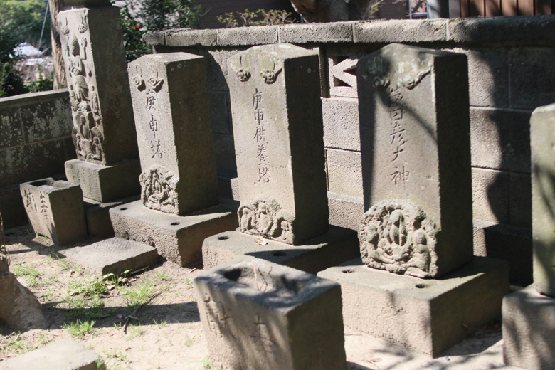 境内に建てられている庚申塔は、乱橋村と材木座村各村の道端や辻にあったものを明治九年(1876)の政令により集められたものです。帝釈天(昭和四十年 鎌倉市指定有形民俗資料指定)、阿弥陀如来、猿田彦神、青面金剛像、庚申塔、馬頭観世音、道祖神の計19基が祀られています。