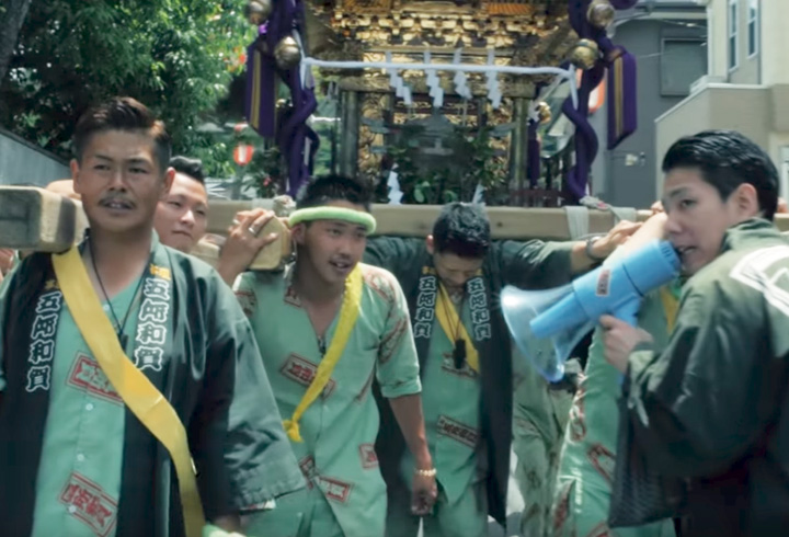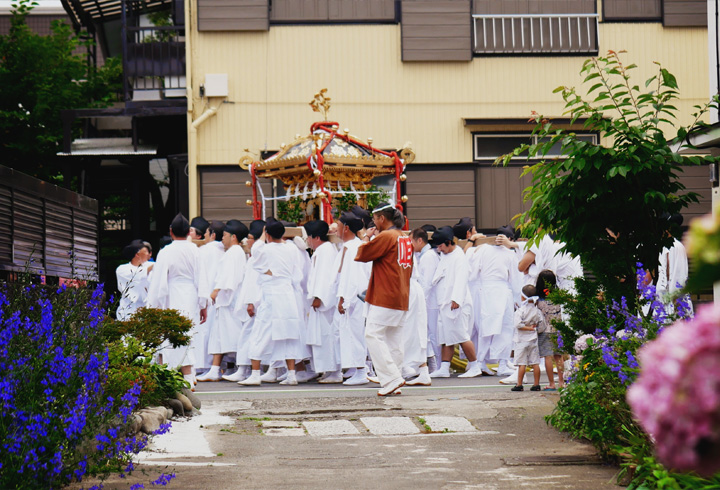 約二世紀前の職人の手により創建された三基の神輿が、子気味のいい子供たちのお囃子に合わせ、海街鎌倉材木座の町を伝統の天王唄と勇ましい湘南ドッコイの唄い声で練り歩く。男たちの担ぐ額の汗がキラキラと日差しに照らされ輝きを見せる時、鎌倉の夏が訪れます。