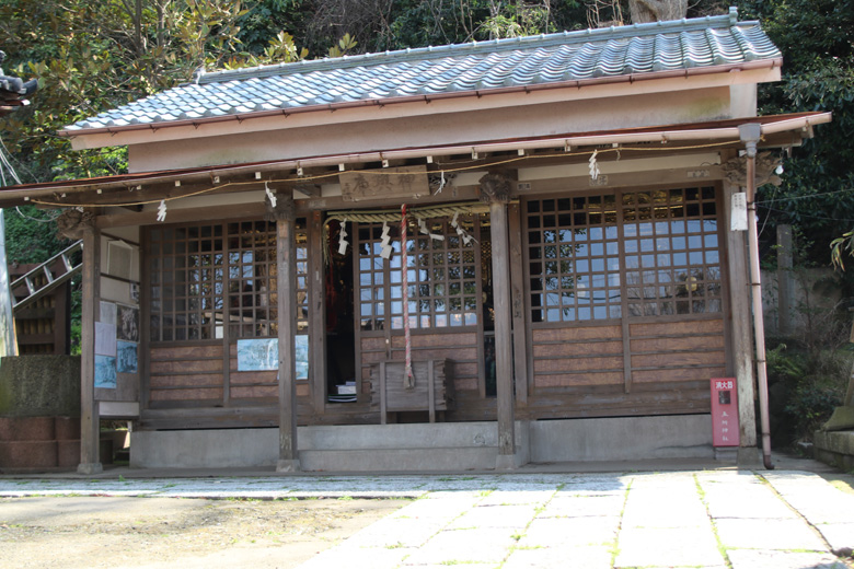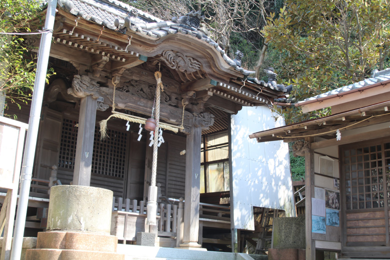古来は豆腐川の河口に鎮座。ここにお祀りしている石は『石上さま』といわれ、漁師の網を切ったり、船を転覆させたり、海水浴客を溺れさせたりといろいろといたずらをする石であったそうです。その後陸に引き揚げられ、昭和九年五月二十一日に補陀洛寺第三十三世光照上人により現在の名を授かり、昭和十二年四月に石祠を建立し、海上安全の守護神としてお祀りしています。