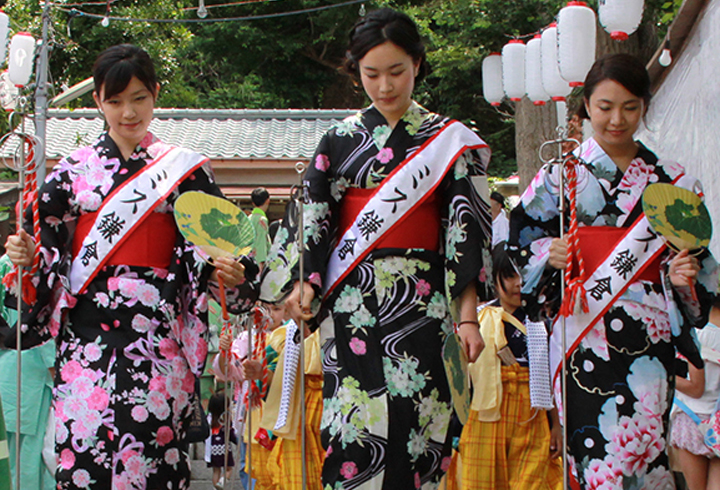 手古舞とは、神幸行列の露払い。材木座の手古舞は昔ながらの稚児行列で、小学生の氏子女子達が「じゃり棒」と呼ばれる杖をつきながら「シャリーン・シャリーン」と音を奏でながら行進します。八年前よりミス鎌倉を先導に迎え、今年で三十四回目となります。またお稚児さんは毎年4月下旬から5月にかけて公募しています。参加ご希望の方は、材木座囃子連中までお問い合わせください。