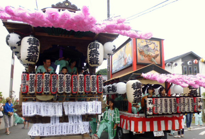 お祭りを彩ることになくてはならないお囃子。材木座囃子連中の子供たちが日ごろの成果を発表する舞台として今もなお現役で活躍する材木座の山車。昇り竜が刻された一木造りの「山車」は、鎌倉市内では現役で使用している中でその歴史はもっとも古く、昭和九年に材木座の職人の手により建造されました。山車の車輪が木製のため、当時お祭りが終わると山車から外され、光明寺の池の中や材木座公会堂の敷地にある防火水槽に沈めて割れを防いだと伝えられています。