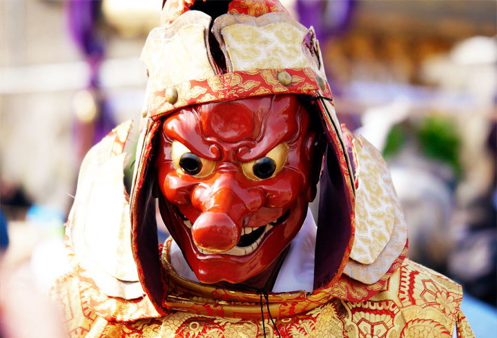 神幸行列の先頭に天狗のお面をかぶった役が先導するのをよく見ると思いますが、実は天狗ではなく神様。彼は猿田彦命(サルタヒコノカミ)といい、神幸行列を先導する役目。その昔、天孫降臨の際に道案内をしたということから「導きの神」と古来から言い伝えられています。方位除け、家業繁栄、交通安全などのご利益をもつ道祖神。神幸祭の際は、是非お参りください。